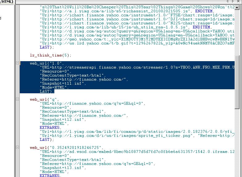 I am reminded of something a senior performance tester once told me. He said LoadRunner is very good at generating a lot of code. As I began to work on a performance testing exercise he assigned me I quickly realized truer words were never spoken. The first part of the assignment was to navigate to the www.finance.yahoo.com site and obtain a quote for General Electric Co. If ever there was a site to cut your chops on this is the one. To give you an example of what I’m talking about, below is a snapshot of the code generated by LoadRunner for simply loading the yahoo finance website, and obtaining a stock quote for a company: