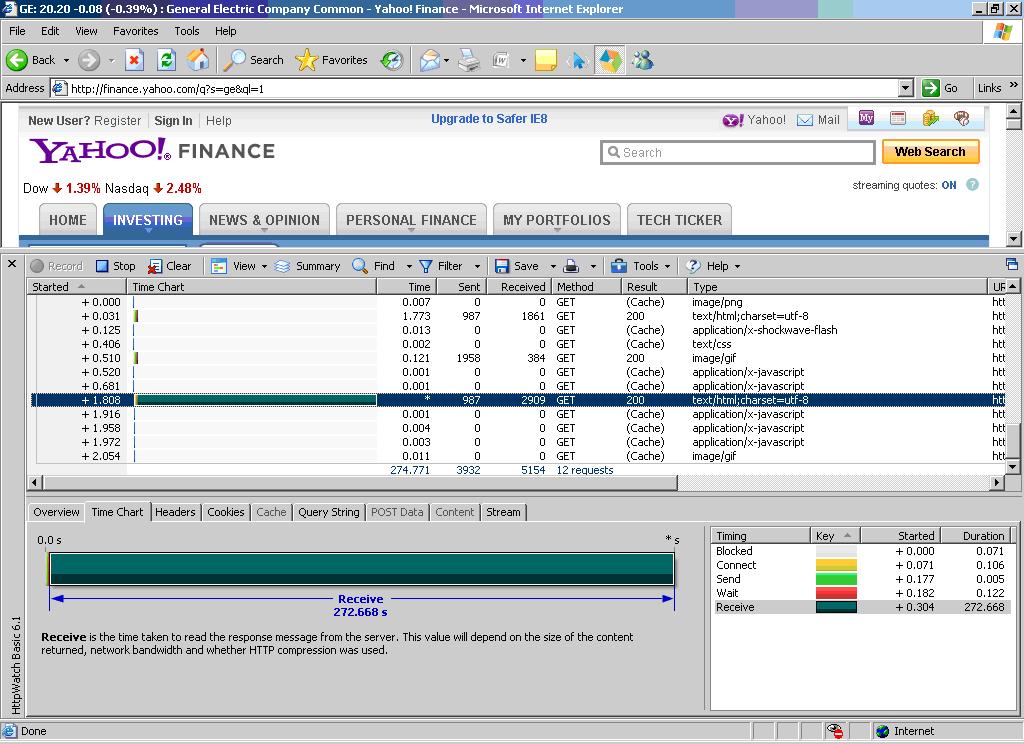 I couldn’t figure out why this code was causing an issue and I certainly didn’t want to just arbitrarily comment it out without having an understanding of the potential impact. Surely I’m not the first person to encounter this error message so I decided to Google it. I learned that LoadRunner provides functionality to increase the timeout on an http request. I thought greatly increasing this number would solve my issue, sadly it did not. No matter how high I set the timeout threshold the script would still fail. So this got me thinking, what is being requested? What I needed was a tool that would provide insight into this particular GET request…enter “HTTPWatch.” HTTPWatch is an add-in tool for IE and Firefox browsers that sniffs/monitors http traffic. I played with this tool on a number of occasions before and I remembered that it provided detailed information about HTTP traffic. Once I had the tool installed I executed the same steps used when recording the LoadRunner script. I noticed all the GET requests had a time associated with their duration; all except one. I decided to look into this particular request a little more. This is where it started to get exciting. I selected this request from HTTPWatch and used the “Time Chart” tab to look at this request in isolation: